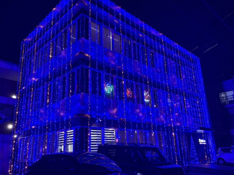さらに2階の窓には、雪だるまや犬、猫の電飾も加わり、ちょっとした遊び心も感じられる仕上がりになっています。